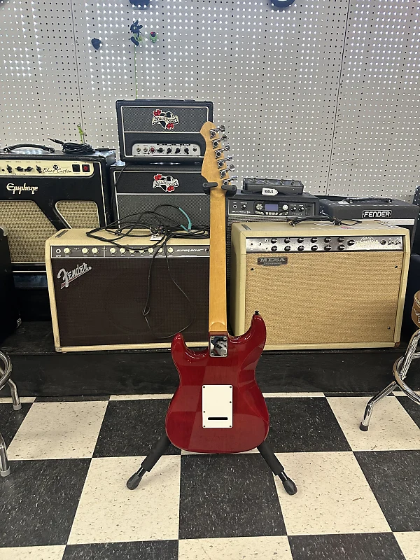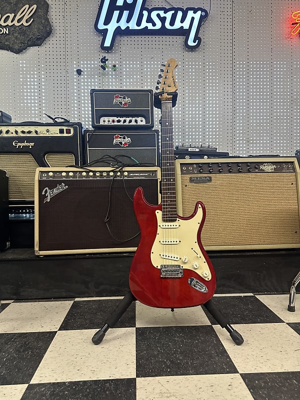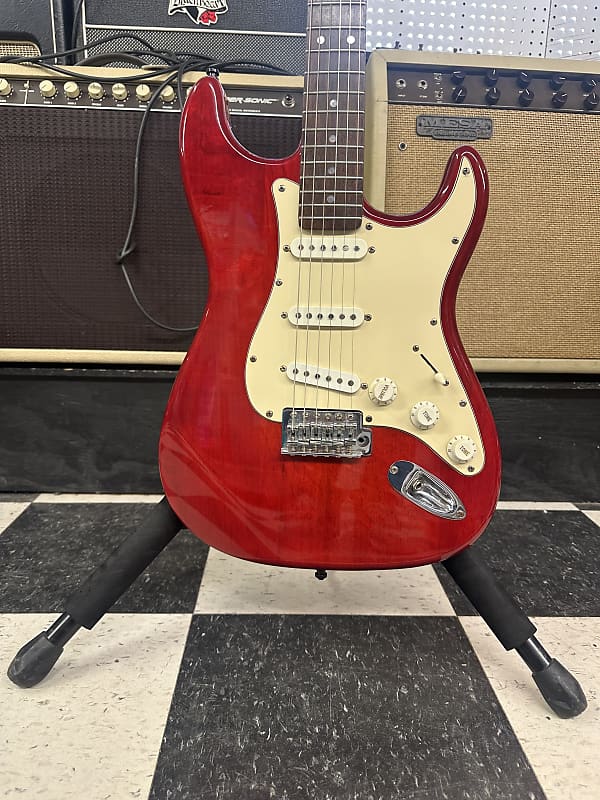 Aria STG series electric guitar. In good shape. Has a few small blemishes but overall it is in pretty good shape for the age. The electronics work on the guitar as they should. The action is low and it plays well. This is a really nice playing, low cost guitar.