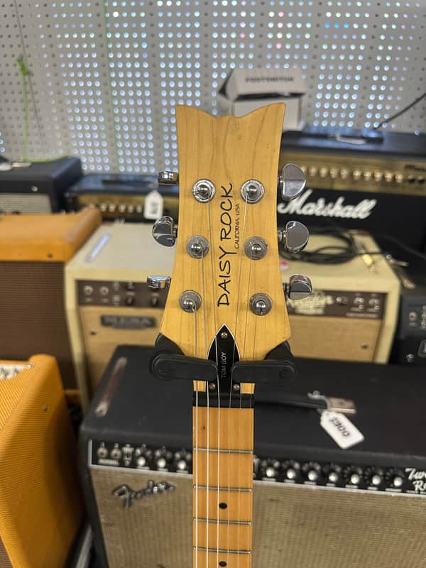 Daisy Rock Tomboy electric guitar. A cool looking axe. Cosmetically it has some rust on hardware, small blemishes, and light scratches. Nothing too big or ugly. The action is currently low and it plays well. Kind of a cool piece. Stop by the shop and check it out.