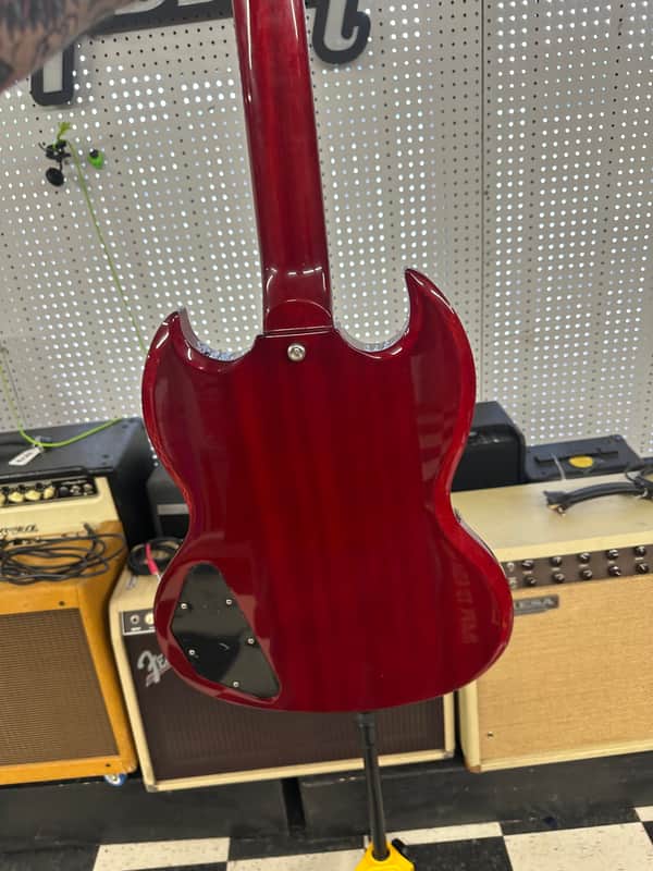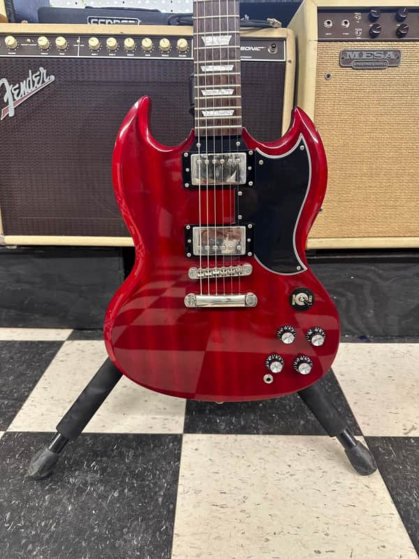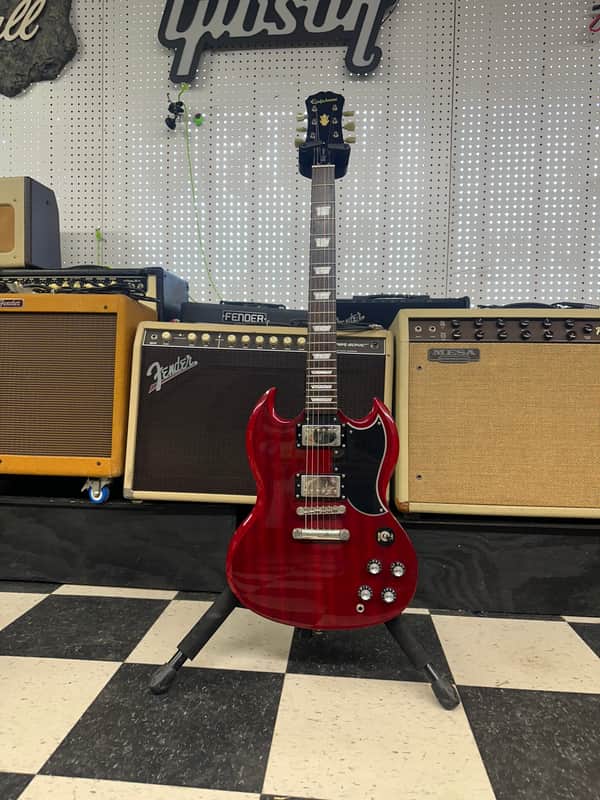 Epiphone SG Pro. In really good shape. it does have a few small blemishes. Nothing too big or ugly. No cracks or repairs. The electronics work on the guitar as they should. The action is currently ow and it plays well.