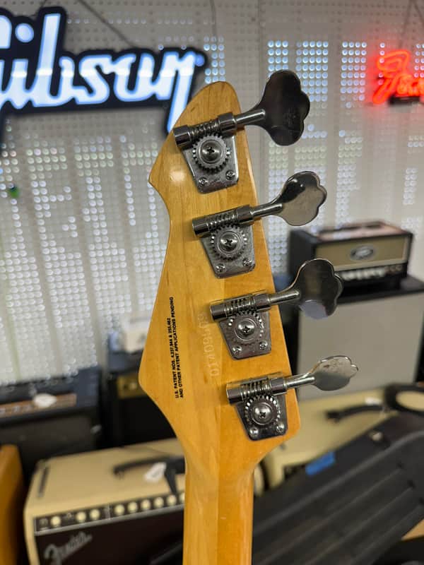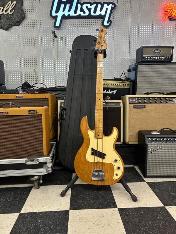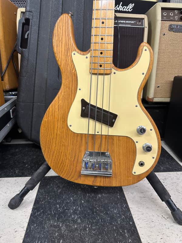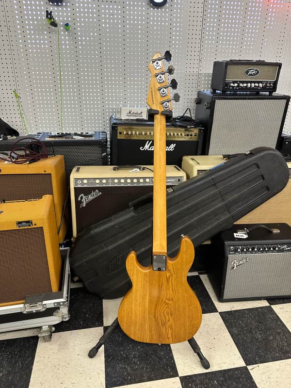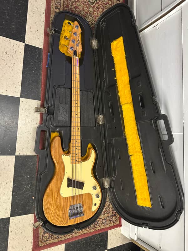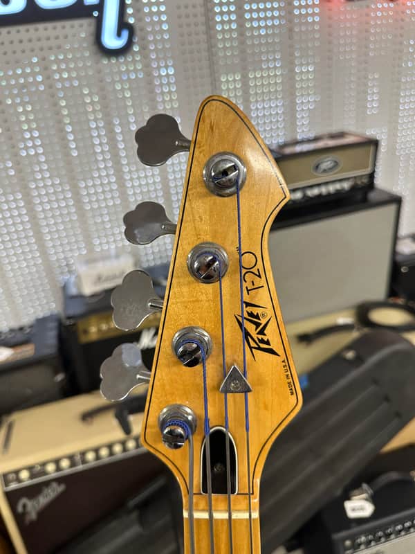 Peavey T-20 bass guitar. Super cool basses! The light weight T-40. A tone you can’t match. Cosmetically In nice shape for the age. It has some small blemishes on body here and there. No big dings or cracks. The electronics work on the guitar as they should. The action is low and it plays well. It comes in the Original case. The case has lining replaced. The foam in these often deteriorates.