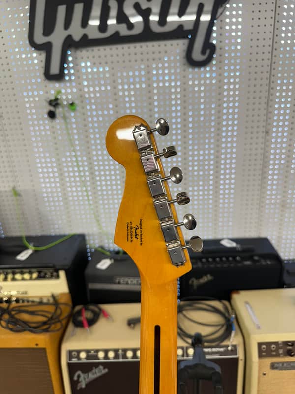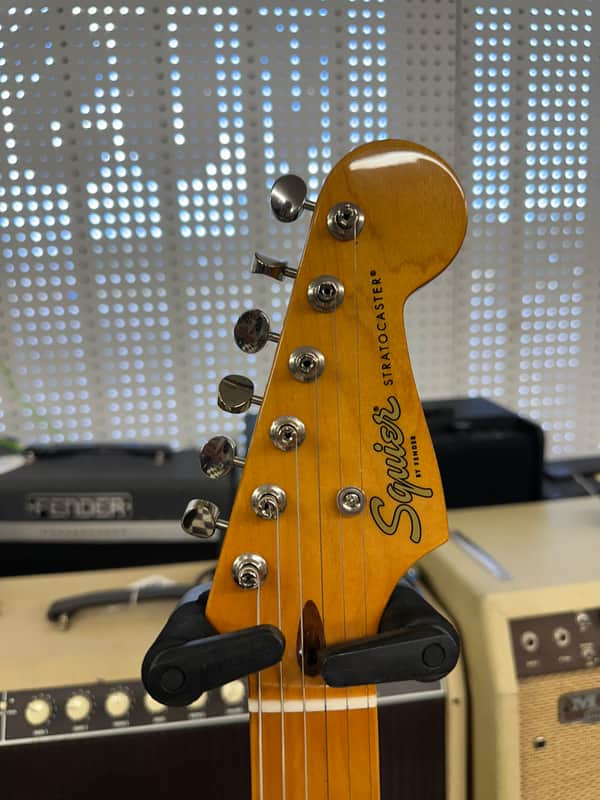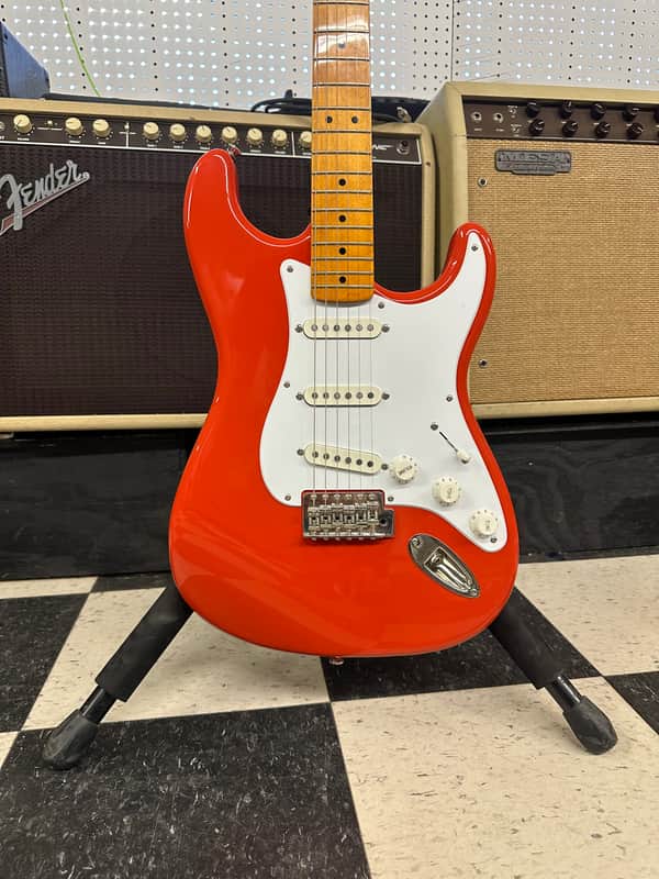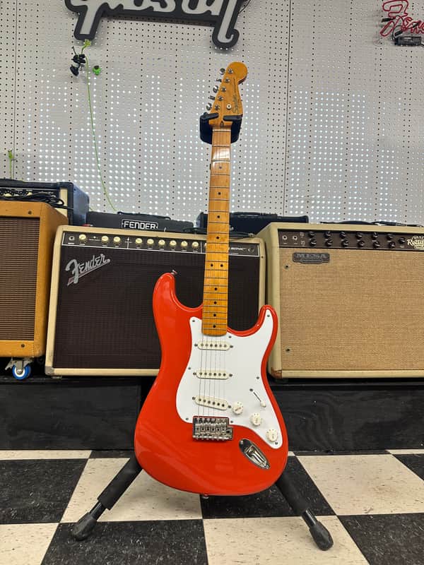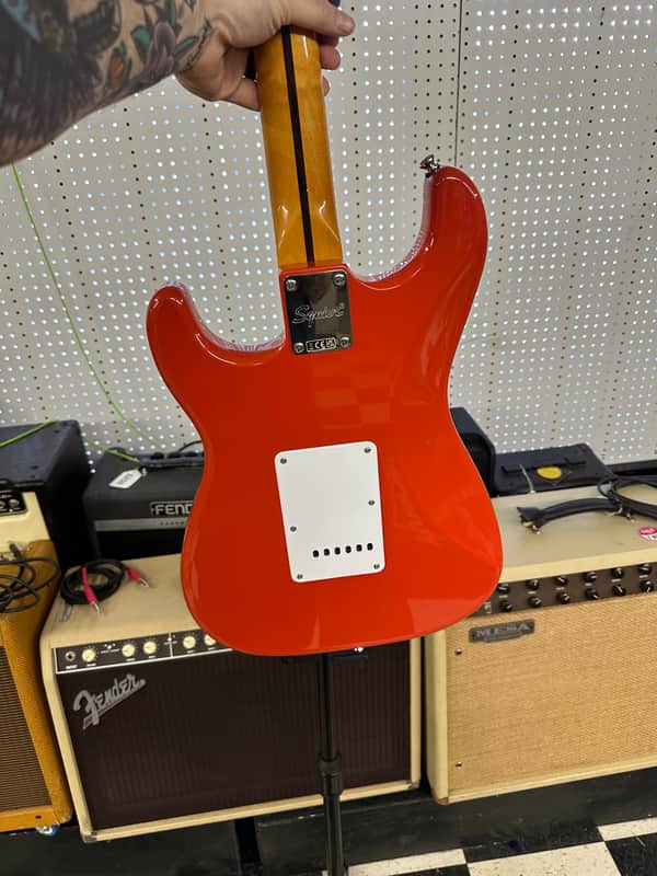 Squier Classic Vibe in fiesta red. The guitar is really clean. No big dings or blemishes. Minimal wear. The electronics work on the guitar as they should. The action is low and it plays well.