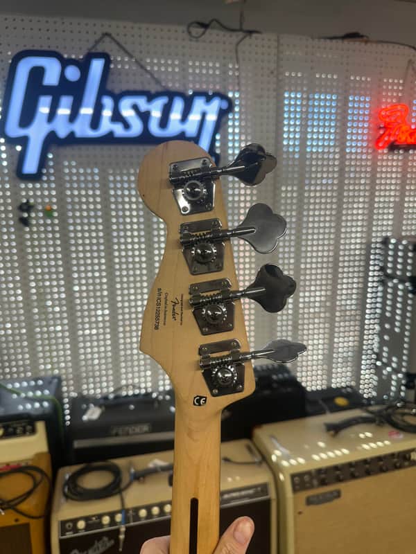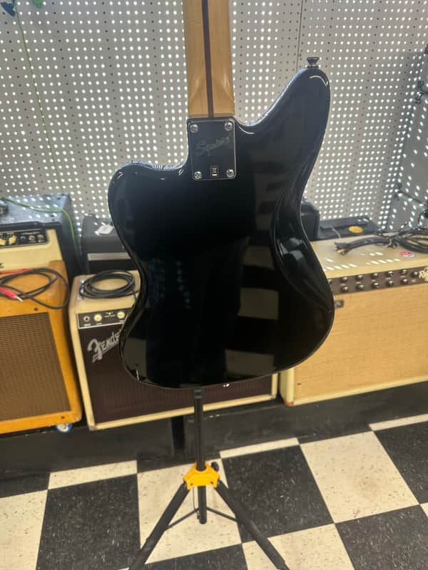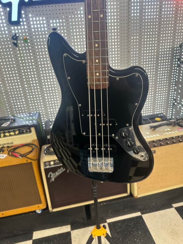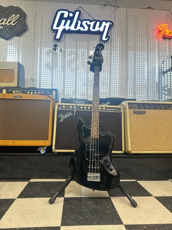 Squier Vintage Modified Jaguar bass. Short scale. In pretty good shape. It has a few blemishes and finish wear. Small neck pocket paint cracks. All cosmetic. Super light weight. The electronics work on the guitar as they should. The action is low and it plays well.